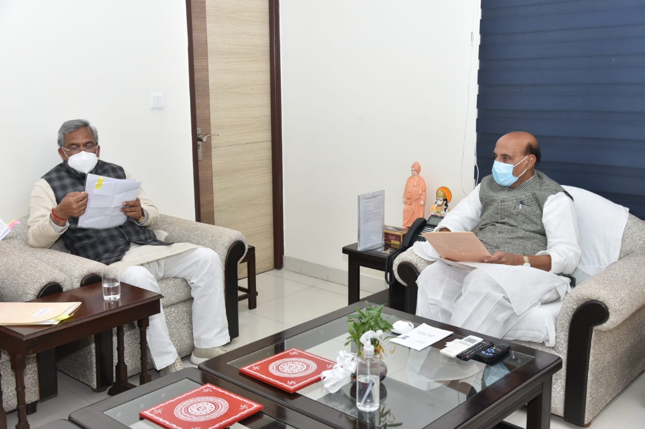 Chief Minister Trivendra Singh Rawatमुख्यमंत्री त्रिवेन्द्र सिंह रावत ने नई दिल्ली में रक्षा मंत्री श्री राजनाथ सिंह से भेंट की। मुख्यमंत्री ने रक्षा मंत्री को देहरादून में प्रस्तावित कोस्ट गार्ड रिक्रूटमेंट सेंटर की अद्यतन सिथति की जानकारी देते हुए बताया कि कुंआवाला में कोस्ट गार्ड भर्ती सेंटर के लिए रक्षा मंत्रालय को सशुल्क भूमि प्रस्तावित की गई है। मुख्यमंत्री ने कहा कि उत्तराखण्ड की ग्रीष्मकालीन राजधानी गैरसैंण के निकट चैखुटिया में हवाई पट्टी बनाने का प्रस्ताव भारत सरकार को प्रेषित किया गया है। गैरसैंण के समीप होने के साथ ही सामरिक दृष्टि से भी इसका बहुत महत्व है। मुख्यमंत्री ने धारचूला से लिपुलेख तक सड़क सम्पर्क स्थापित कर मानसरोवर यात्रा के लिए लिंक रोड शुरू किए जाने पर रक्षा मंत्री का आभार व्यक्त किया। दोनों के मध्य रूद्रप्रयाग जिले में सैनिक स्कूल स्थापित किए जाने पर भी चर्चा हुई। रक्षा मंत्री श्री राजनाथ सिंह ने कहा कि देश की सीमाओं की रक्षा में उत्तराखण्ड के जवानों का हमेशा बड़ा योगदान रहा है। केंद्र द्वारा उत्तराखण्ड को हर सम्भव सहयोग दिया जा रहा है। मुख्यमंत्री ने रक्षा मंत्री को जोशीमठ क्षेत्र में आपदा के बाद संचालित राहत व बचाव कार्यों की भी जानकारी दी।
