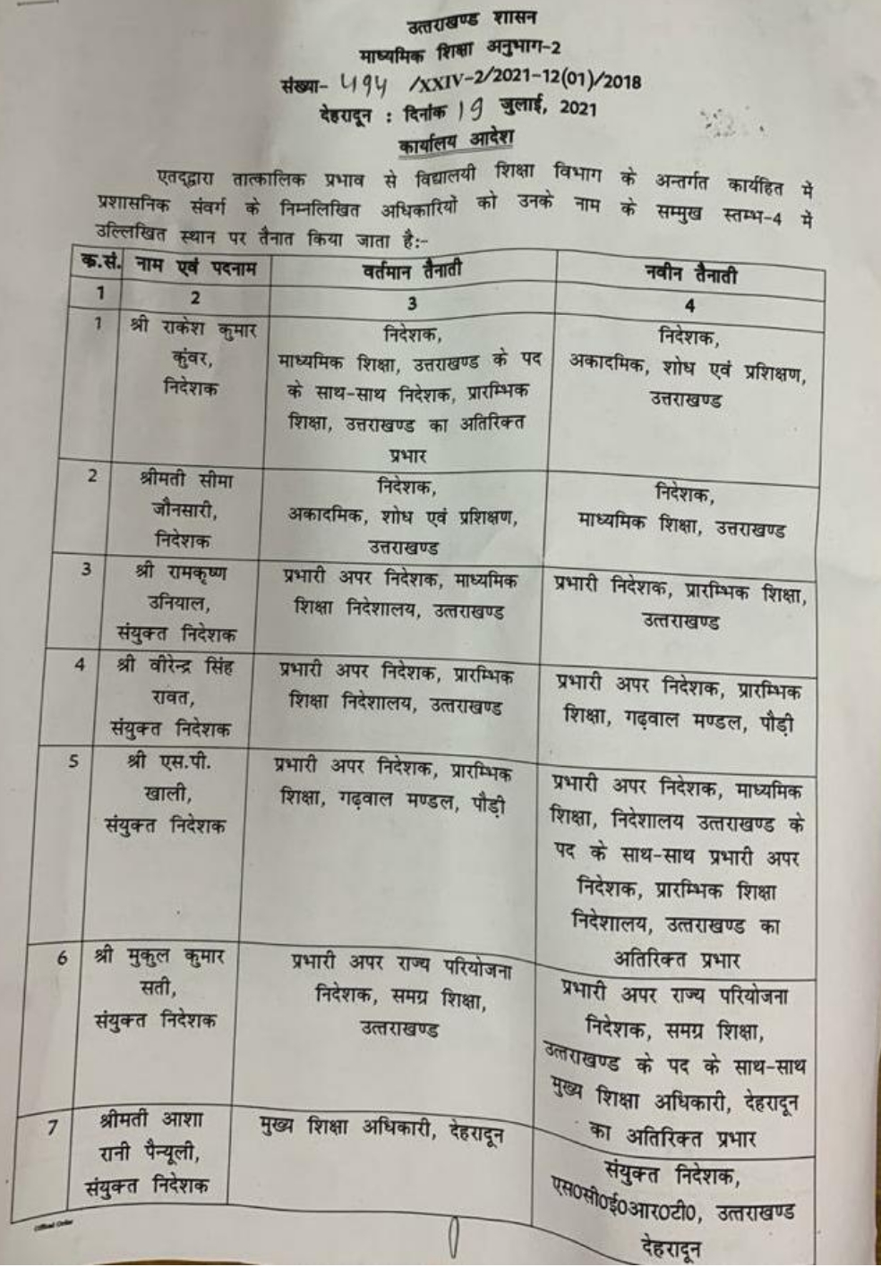 देहरादून। शिक्षा विभाग के टॉप अफसरों को  सरकार ने इधर से उधर कर दिया है। निदेशक माध्यमिक शिक्षा की जिम्मेदारी सीमा जौनसारी थी प्रभारी निदेशक प्रारम्भिक शिक्षा रामकृष्ण उनियाल को बनाया गया है। लम्बे समय से निदेशक रहे आरके कुंवर को निदेशक अकादमिक शोध एवं प्रशिक्षण की जिम्मेदारी दी गई।