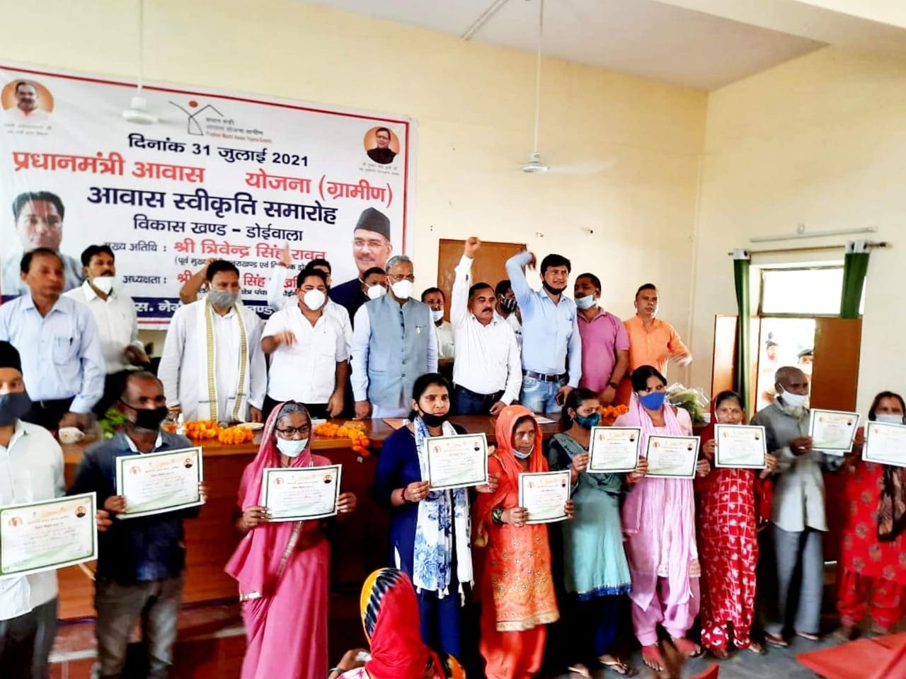 डोईवाला। ब्लाक सभागार में आयोजित प्रधानमंत्री आवास योजना (ग्रामीण) आवास स्वीकृति समारोह में पूर्व मुख्यमंत्री और डोईवाला विधायक त्रिवेंद्र सिंह रावत ने लाभार्थियों को प्रमाण पत्र वितरित किए।