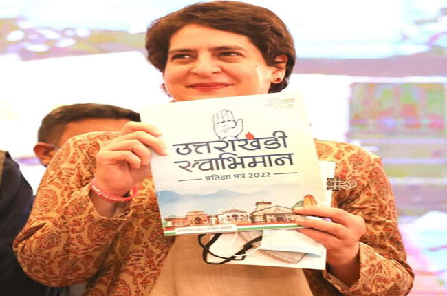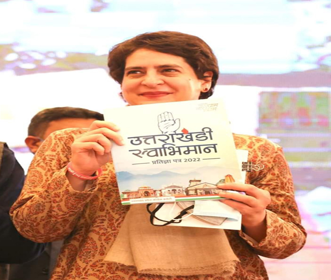 कांग्रेस महासचिव प्रियंका गांधी ने उत्तराखंडी स्वाभिमान प्रतिज्ञा पत्र देहरादून में जारी किया। इस अवसर पर कांग्रेस प्रभारी देवेंद्र यादव, पूर्व मुख्यमंत्री हरीश रावत, प्रदेश कांग्रेस अध्यक्ष गणेश गोदियाल आदि मौजूद रहे। कांग्रेस ने घोषणा पत्र में हर गांव हर द्वार स्वास्थ्य सुविधाएं देने का भी ऐलान किया है।