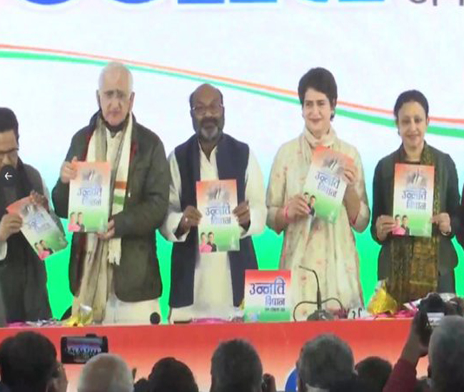 लखनऊ। कांग्रेस महासचिव प्रियंका गांधी वाड्रा ने उत्तर प्रदेश विधानसभा चुनाव(Uttar Pradesh Assembly Elections) के लिये उन्नति विधान जन घोषणा पत्र जारी किया। कांग्रेस ने अपने घोषणा पत्र में सरकार बनने के 10 दिन के भीतर किसानों का पूरा कर्ज माफ करने और नौकरियों में महिलाओं को 40 प्रतिशत आरक्षण देने जैसी अन्य चुनावी वादों को शामिल किया है। कांग्रेस प्रदेश अध्यक्ष अजय सिंह लल्लू और पूर्व अध्यक्ष सलमान खुर्शीद सहित अन्य नेताओं की मौजूदगी में प्रियंका गांधी ने जारी किया घोषणा पत्र ।