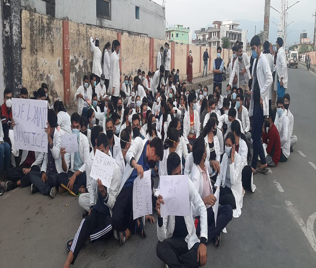 फीस वृद्धि : एमबीबीएस स्टूडेंट ने किया जौलीग्रांट में रास्ता जाम