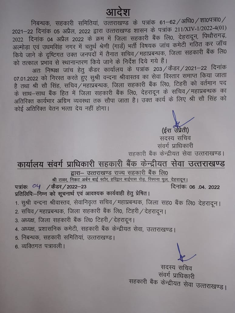 साथ ही देहरादून को आपरेटिव बैंक की महाप्रबंधक बंदना श्रीवास्तव का सेवा विस्तार भी रोक दिया गया है। इस संबंध में सहकारी बैंक केंद्रीय सेवा के सदस्य सचिव ईरा उप्रेती की ओर से आदेश भी जारी कर दिया गया है।