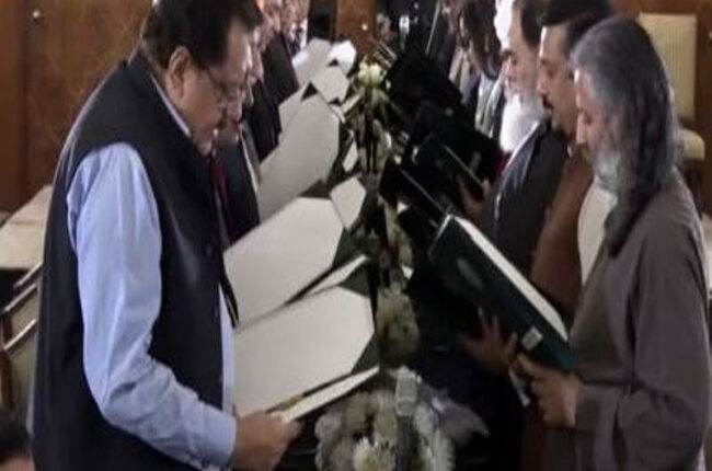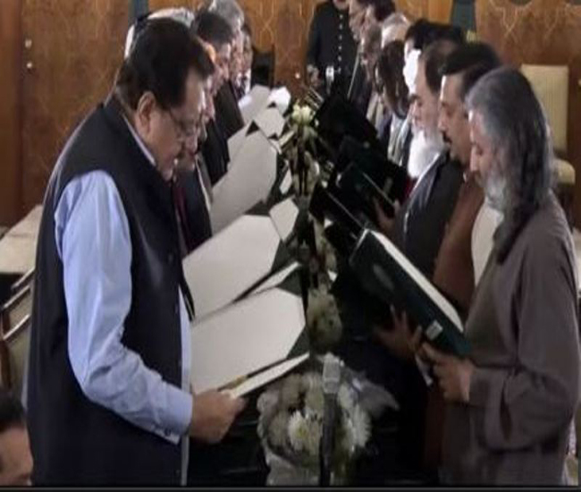 इस्लामाबाद। पाकिस्तान के प्रधानमंत्री शहबाज शरीफ की नयी कैबिनेट ने आज शपथ ले ली। कैबिनेट ने ऐवान-ए-सदर में आयोजित शपथ ग्रहण समारोह में शपथ ली। सीनेट के अध्यक्ष सादिक संजारानी ने कैबिनेट के सदस्यों को शपथ दिलायी।