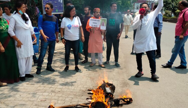 इसको देखते हुए भू कानून की मांग कर रहे सदस्यों ने गांधी पार्क से घंटाघर तक यात्रा निकालकर मुख्यमंत्री पुष्कर सिंह धामी का पुतला दहन किया ।