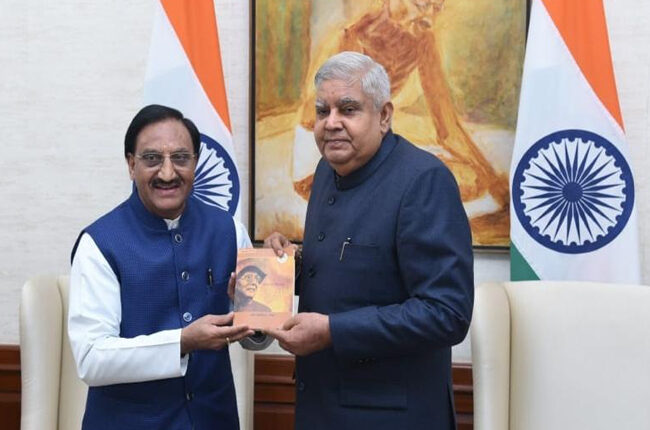 नयी दिल्ली। पूर्व केंद्रीय मंत्री डॉ रमेश पोखरियाल निशंक ने उपराष्ट्रपति भवन में उपराष्ट्रपति जगदीप सिंह धनखड़ से शिष्टाचार भेंट कर उन्हें अपनी पुस्तक “पेशावर के महानायक वीर चंद्र सिंह गढ़वाली” की प्रथम प्रति भेंट की।