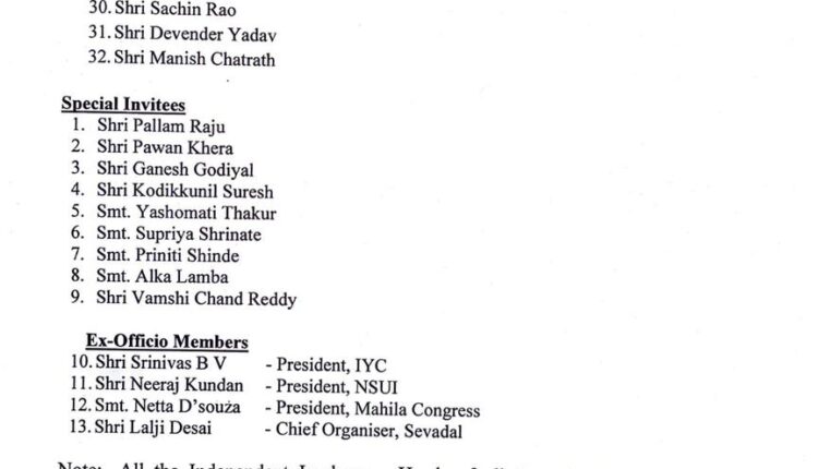 पार्टी के संगठन महासचिव केसी वेणुगोपाल की ओर से जारी विज्ञप्ति के अनुसार, कांग्रेस कार्य समिति में 39 सदस्य, 32 स्थायी आमंत्रित सदस्य और नौ विशेष आमंत्रित सदस्य शामिल किए गए हैं। कांग्रेस के चारों अग्रिम संगठनों-युवा कांग्रेस, एनएसयूआई, महिला कांग्रेस और सेवा दल के प्रमुख सीडब्ल्यूसी में पदेन सदस्य होंगे।