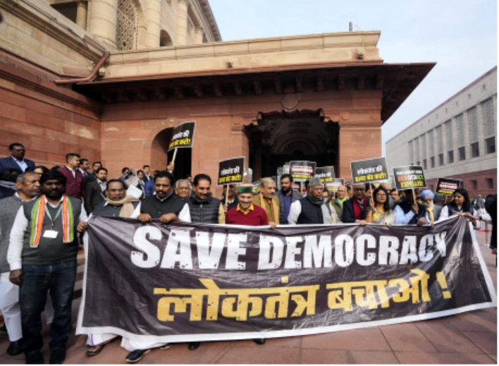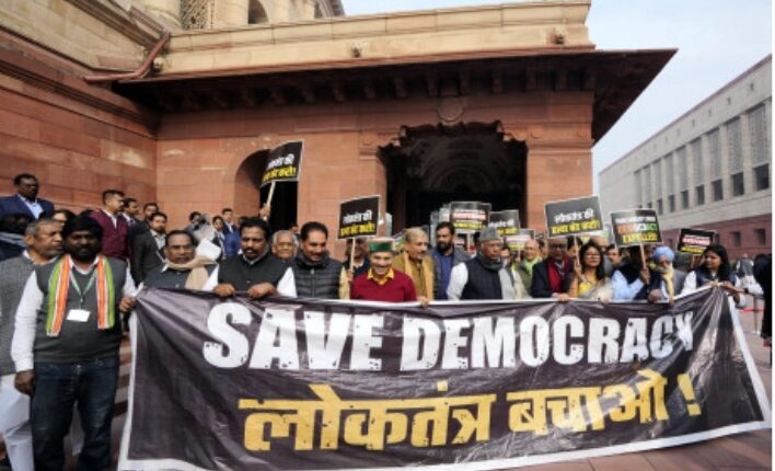 विपक्षी सांसदों ने 140 सदस्यों के निलंबन पर निकाला विरोध मार्च