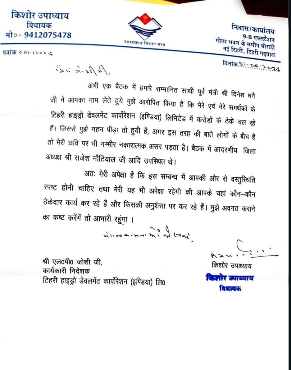 देहरादून। टिहरी से भाजपा विधायक किशोर उपाध्याय के टिहरी हाइड्रो डेवलपमेंट प्रोजेक्ट इंडिया लिमिटेड के निदेशक को लिखी चिट्ठी पर उत्तराखंड कांग्रेस की मुख्य प्रवक्ता गरिमा मेहरा दसौनी ने बयान जारी कर भारतीय जनता पार्टी पर कटाक्ष किया है और कहा है कि दल बदल पर प्रदेश में रुझान आने लगे हैं।