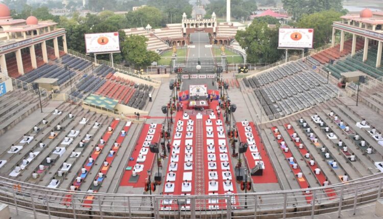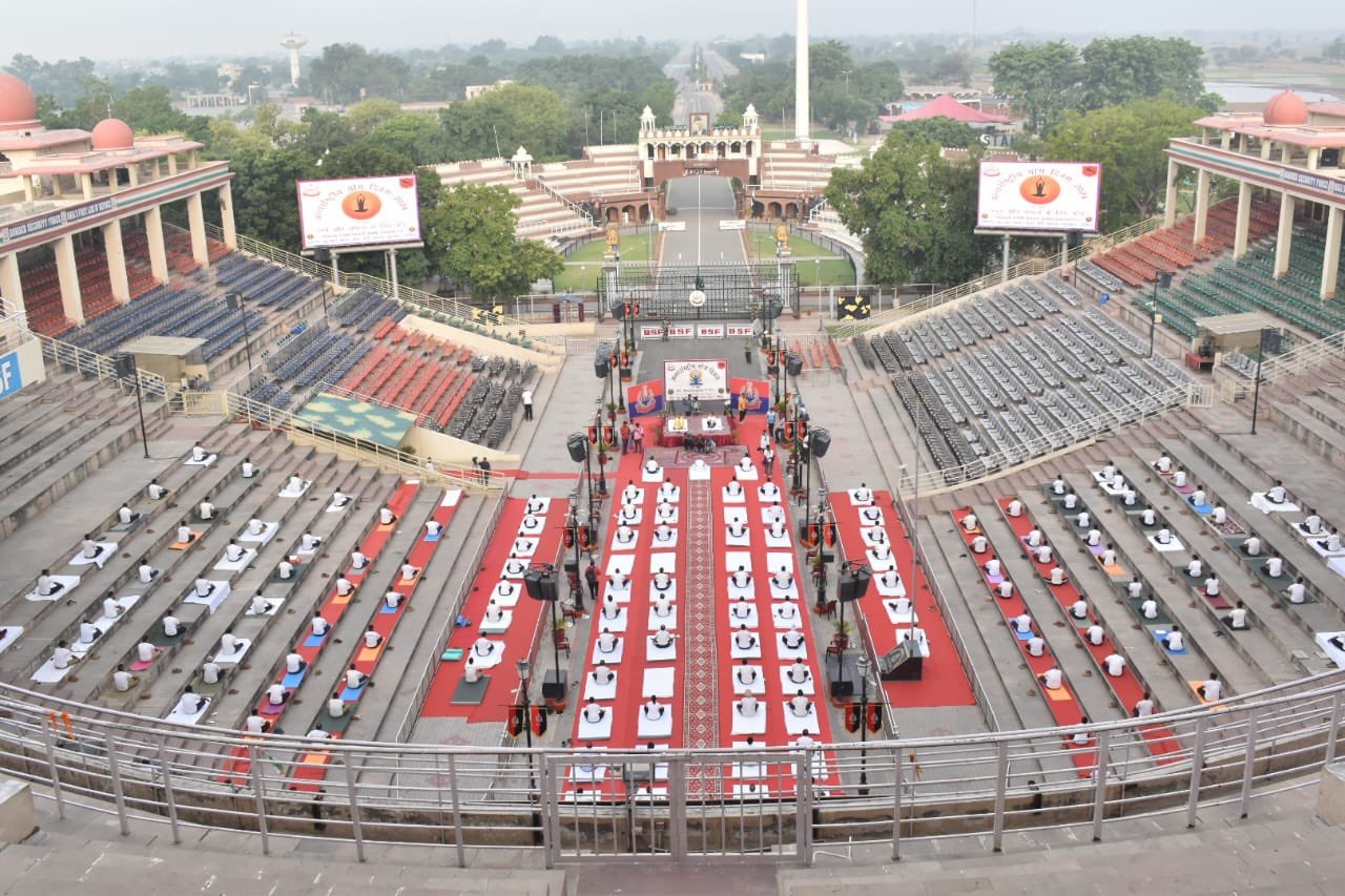 अमृतसर के निकट अटारी-बाघा सीमा पर रिट्रीट सैरेमनी वाले स्थान पर योग दिवस समारोह का आयोजन किया गया। बीएसएफ ने योग दिवस समारोह के ड्रोन फोटो जारी किए। जिसमें भारतीय सीमा में जवान योग कर रहे हैं तो सामने पाकिस्तानी क्षेत्र में पाक रेंजरों का आवागमन दिखाई दे रहा है। सोशल मीडिया पर बीएसएफ द्वारा जारी अटारी सीमा की फोटो आज खूब वायरल हो रही हैं।