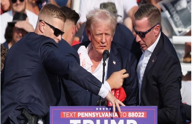 बटलर (अमेरिका)। ‘गॉड ब्लेस द यूएसए’ के नारों के बीच शनिवार शाम छह बजकर दो मिनट पर अमेरिका के पूर्व राष्ट्रपति डोनाल्ड ट्रंप ने पेनसिल्वेनिया के बटलर में एक मैदान में भीड़ का अभिवादन करते हुए मंच संभाला और कड़ी धूप के बीच अपना भाषण शुरू ही किया था कि कुछ मिनटों बाद गोलियां चलने की आवाज सुनाई देने लगी।