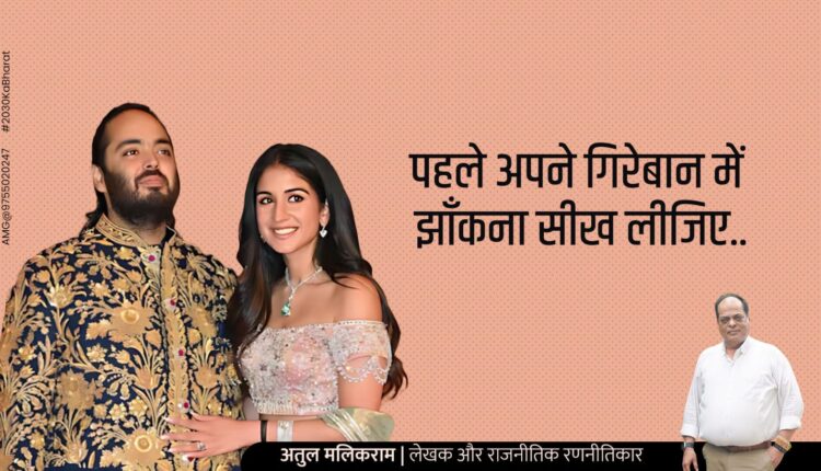 अंबानी जी ने अपने सागर में से एक गागर पानी निकाला है, सागर भी उन्हीं का, और गागर भी उन्हीं का, लेकिन सारी की सारी समस्या हमें है.. सच में बड़े ही अजीब लोग हैं हम.. जितने भी लोग सवाल उठा रहे हैं, सब के सब बेबुनियाद हैं। जरूरतें बनी रहेगी संघर्ष होता रहेगा, रोटी कपड़ा मकान के लिए। लेकिन, जीवन में खुशियों को बाँटने और जीने का अधिकार सभी को है, सो उन्होंने भी शादी के इस आयोजन में किया। उन्होंने जिस तरह की शाही शादी की है, अन्य देशों के लोग उसकी तारीफें कर-करके थक नहीं रहे हैं, और एक हम, अपने ही लोगों की टाँग खींचने का काम करने में लगे रहते हैं। उम्मीद है, मुद्दा उठाने वाले तमाम लोगों को सारे सवालों का जवाब मिल गया होगा.. मेरी ओर से नव जोड़े को परिणय सूत्र में बँधने की अनंत शुभकामनाएँ..