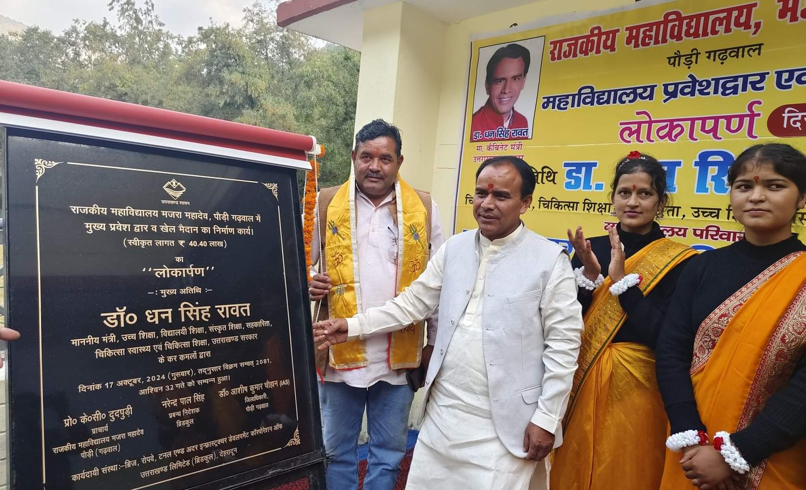कैबिनेट मंत्री डॉ. धन सिंह रावत ने श्रीनगर विधानसभा के अंतर्गत थलीसैंण के राजकीय महाविद्यालय मजरा महादेव के मुख्य प्रवेश द्वार एवं खेल मैदान, पैठाणी बाजार की पेयजल योजना के सुधारीकरण के कार्य का लोकार्पण तथा पैठाणी-नौटी मोटर मार्ग के पैठाणी पुल से बाजार तक सुधारीकरण के कार्य का शिलान्यास किया।