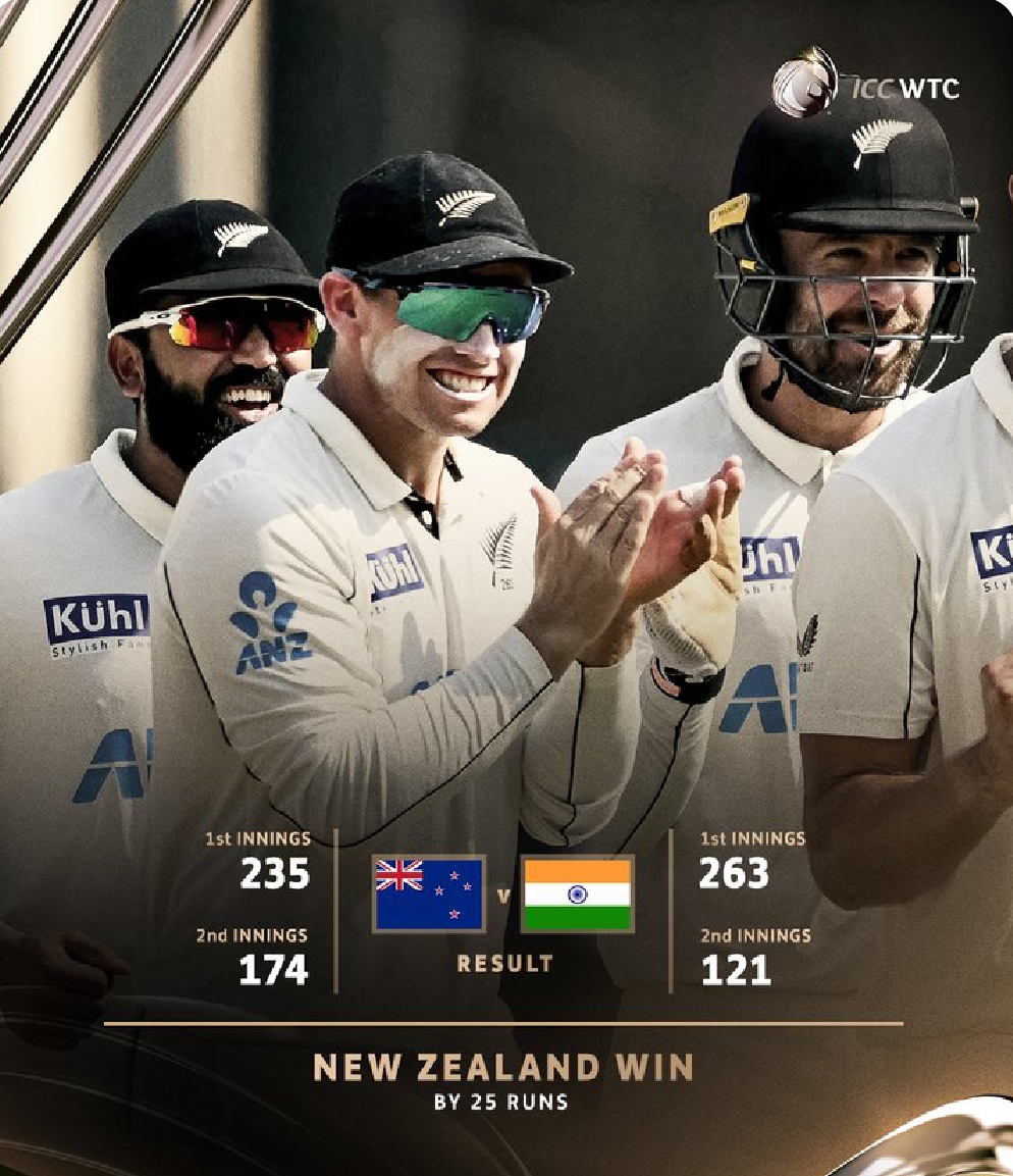 मुंबई में वानखेड़े स्टेडियम में खेले गए मुकाबले टॉस जीतकर पहले बल्लेबाजी करते हुए न्यूजीलैंड ने अपनी पहली पारी में 235 रन बनाए थे। जवाब में भारतीय टीम पहली पारी में 263 रन पर ऑलआउट हो गई। भारत को 28 रन की बढ़त मिली थी। इसके जवाब में न्यूजीलैंड की दूसरी पारी 174 रन पर खत्म हुई। भारत के सामने 147 रन का टारगेट था। जवाब में टीम 121 रन पर ऑलआउट हो गई। भारत के लिए रवींद्र जडेजा ने 10 विकेट झटके। वहीं न्यूजीलैंड की तरफ से मैच में एजाज पटेल ने 11 विकेट अपने नाम किए।