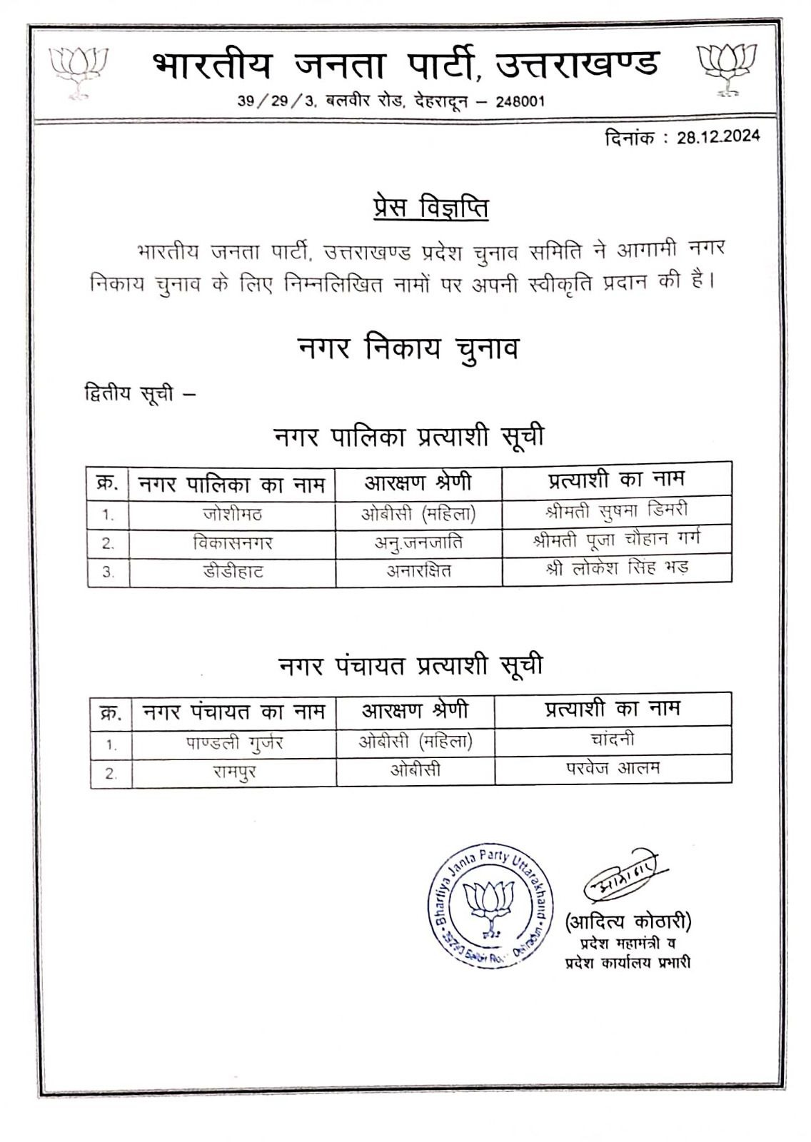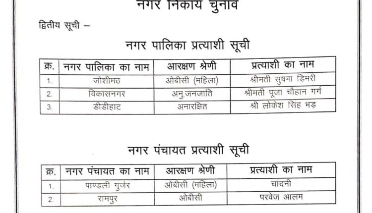 नगर पालिका उम्मीदवारों की सूची में जोशीमठ, विकासनगर और डीडीहाट नगर पालिका से कुल तीन उम्मीदवारों की घोषणा की गई है। इनमें जोशीमठ (ओबीसी महिला) से सुषमा डिमरी, विकासनगर (अनुसूचित जनजाति) पूजा चौहान गर्ग व डीडीहाट (अनारक्षित) से लोकेश सिंह भड़ हैं। वहीं, नगर पंचायत उम्मीदवारों की सूची में पाण्डली गुर्जर और रामपुर नगर पंचायतों के लिए दो नामों की घोषणा की गई है, जिनमें पाण्डली गुर्जर (ओबीसी महिला) से चांदनी व रामपुर (ओबीसी) से परवेज आलम हैं।