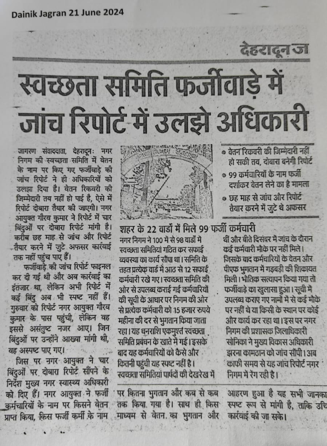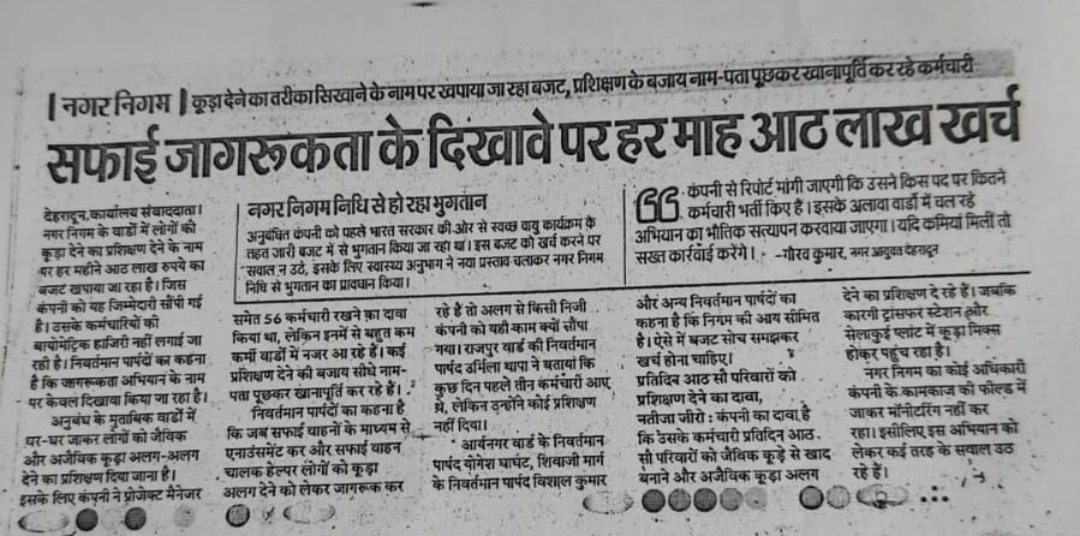 दसौनी ने कहा कि पिछले 15 सालों से भारतीय जनता पार्टी देहरादून नगर निगम पर काबिज है जिसके चलते नगर निगम देहरादून भ्रष्टाचार का अड्डा बन गया। गरिमा ने 26 पन्नों का पीडीएफ जारी करते हुए नगर निगम देहरादून का पिछले 5 साल का भ्रष्टाचार सामने रखते हुए कहा की देहरादून नगर निगम भाजपा के शासन में हर मोर्चे पर विफल रहा है। गरिमा ने सवाल पूछते हुए कहा कि क्या कारण है कि संकल्प पत्र में पिछले 15 सालों का रिपोर्ट कार्ड जनता के बीच नहीं रखा गया है, किसी उपलब्धि का ब्यौरा नहीं है ,भाजपा ने कौन-कौन से मील के पत्थर स्थापित किए ?पर्यावरण की दृष्टि या टाउन प्लानिंग की दृष्टि से क्या कदम उठाए गए? दसौनी ने सिलसिलेवार संकल्प पत्र के बिंदुओं पर पलटवार करते हुए कहा कि संकल्प पत्र में जारी कि गई सभी बातें या तो झूठ हैं या फिर कांग्रेस कार्यकाल की हैं। संकल्प पत्र में जितने दावे और वादे जनता से किए गए हैं उन्हें पिछले 15 सालों में पूरा क्यों नहीं किया जा सका। देहरादून में बढ़ चढ़ कर अपराध होते रहे लेकिन सीसीटीवी कैमरा लगाने की बात भारतीय जनता पार्टी संकल्प पत्र में अब कर रही है। गरिमा ने कहा कि पिछले 5 साल जो महापौर नगर निगम देहरादून में काबिज रहे उन पर महापौर रहते हुए अकूत संपत्ति अर्जित करने का गंभीर आरोप लगा। दसौनी ने कहा की 5 साल तक कूड़ा उठाने के आंकड़ों में खेल होता रहा। निगम के अधिकारी 94 प्रतिशत घरों में कूड़ा उठान होने का दावा करते रहे लेकिन सर्वे में हर वार्ड में कहीं दस तो कहीं 20% घरों से ही कूड़ा उठान होने की बात सामने आई, पर्यावरण मित्रों की नियुक्ति और भुगतान को लेकर भी सवाल उठे, सौ कर्मियों की फर्जी तैनाती दर्शाकर हर माह जारी होता रहा वेतन, स्वच्छता समितियां में फर्जीवाड़ा देखने को मिला कागजों में 900 से ज्यादा सफाई कर्मचारी दिखाए गए तैनात, 99 कर्मी केवल कागजों में पाए गए मौके पर नहीं, मोहल्ला स्वच्छता समिति में केंद्र के नियमों को तक पर रखकर फर्जीवाड़ा पाया गया, धांधली में शामिल लोगों को चिन्हित करने की बात तो कही गई लेकिन कोई रिपोर्ट बाहर नहीं आई। सफाई जागरूकता के दिखावे पर हर माह 8 लाख रुपया खर्च करा गया। गरिमा ने कहा की पीडीएफ में भाजपा के कार्यकाल का भ्रष्टाचार उजागर करते हुए सभी समाचार पत्रों की कटिंग लगाई गई हैं और यदि भाजपा इन्हें नकारती है तो वह साफ तौर पर चौथे स्तंभ पर आक्रमण करती है। दसौनी ने कहा कि देहरादून की आम जनता और विपक्षी दलों से भाजपा सरकार ने सभी धरना स्थल एक-एक करके छीन लिए पहले गांधी पार्क और फिर परेड ग्राउंड को प्रतिबंधित कर दिया गया। यातायात को व्यवस्थित करने के लिए कोई कदम नहीं उठाए गए जिससे दिनों दिन स्थानीय जनता की दुश्वारियां बढ़ती चली गई। गरिमा ने भारतीय जनता पार्टी से सवाल कर