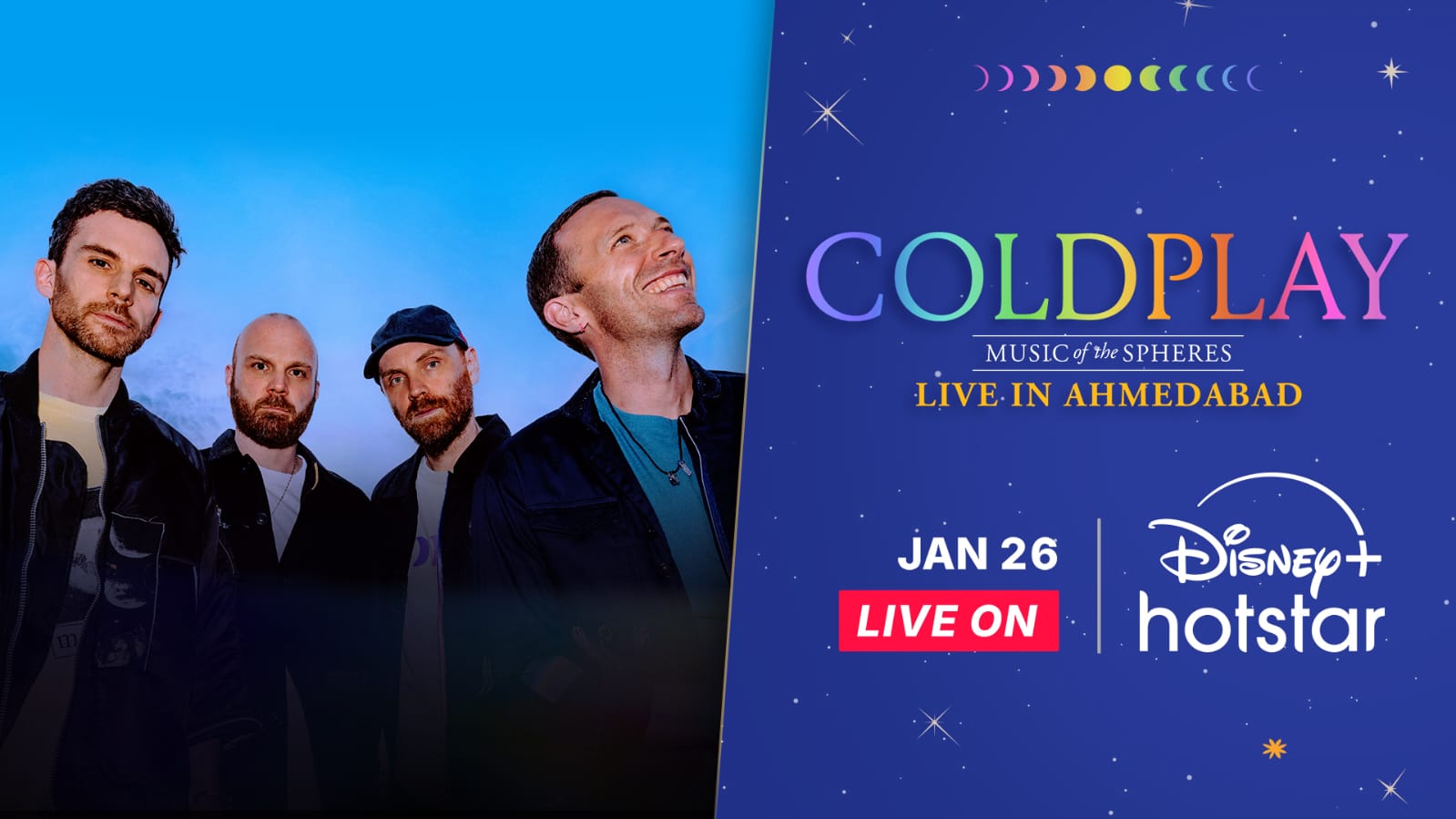 कोल्डप्ले के प्रमुख गायक क्रिस मार्टिन ने अपने भारतीय फैंस को संदेश में कहा, “नमस्ते! हमें यह बताते हुए खुशी हो रही है कि 26 जनवरी को अहमदाबाद से हमारा शो डिज़्नी+ हॉटस्टार पर स्ट्रीम होगा। आपके खूबसूरत देश में आने और इस जश्न में शामिल होने को लेकर हम रोमांचित हैं।”