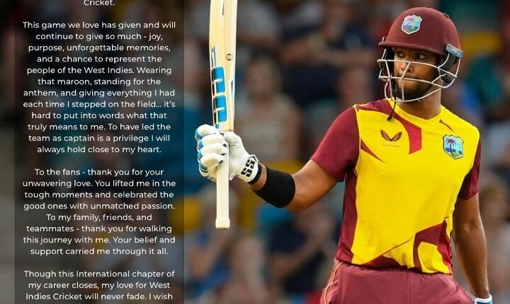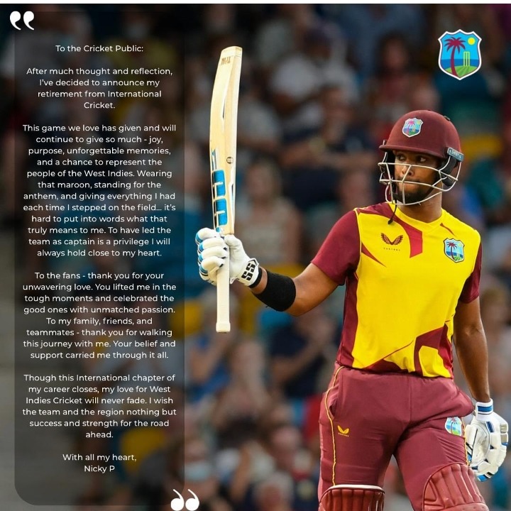 निकोलस पूरन ने इंस्टाग्राम पर एक भावुक पोस्ट के जरिए अपने संन्यास की घोषणा करते हुए लिखा,”इस खेल ने मुझे बहुत कुछ दिया है – खुशी, उद्देश्य, यादगार लम्हें और वेस्टइंडीज के लोगों का प्रतिनिधित्व करने का सौभाग्य। मारून जर्सी पहनना, राष्ट्रगान के दौरान खड़े होना और मैदान पर अपना सब कुछ देना मेरे लिए गर्व की बात रही है। यह अंतरराष्ट्रीय अध्याय अब खत्म हो रहा है, लेकिन मेरा प्यार वेस्टइंडीज क्रिकेट के लिए कभी खत्म नहीं होगा।”