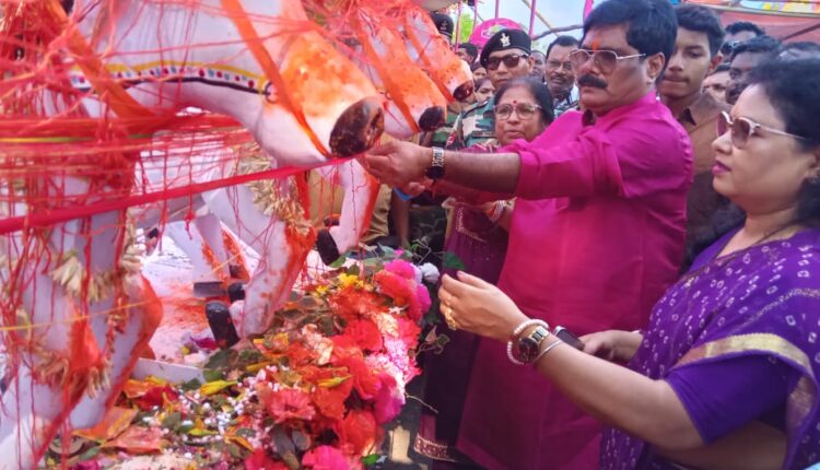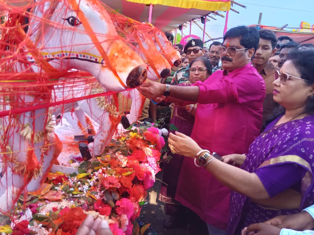 मंत्री योगेंद्र प्रसाद ने नवनिर्मित रथ का फीता काटकर उद्घाटन किया