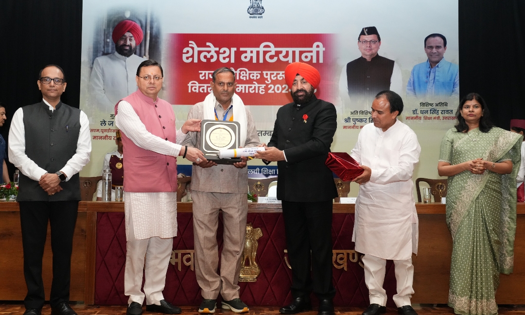 देहरादून। शिक्षक दिवस के अवसर पर शुक्रवार को राजभवन में ‘‘शैलेश मटियानी राज्य शैक्षिक पुरस्कार’’ सम्मान समारोह आयोजित हुआ। समारोह में राज्यपाल लेफ्टिनेंट जनरल गुरमीत सिंह (से नि), मुख्यमंत्री श्री पुष्कर सिंह धामी और शिक्षा मंत्री डॉ. धन सिंह रावत ने वर्ष-2024 में शैलेश मटियानी राज्य शैक्षिक पुरस्कारों के लिए चयनित 16 शिक्षक एवं शिक्षिकाओं को सम्मानित किया। वर्ष-2024 में चयनित 09 प्रारम्भिक शिक्षक, 05 माध्यमिक शिक्षक, 01 शिक्षक प्रशिक्षक एवं 01 संस्कृत शिक्षक को यह सम्मान प्रदान किया गया है। (सूची संलग्न)