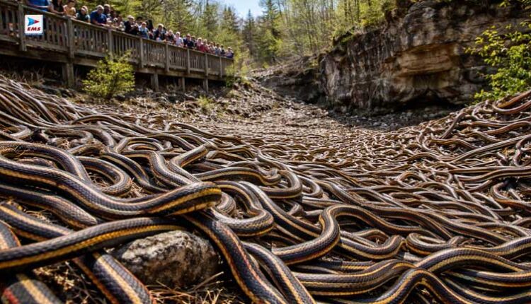 यह अद्भुत स्थल कनाडा के Manitoba प्रांत में स्थित है। यहां मुख्य रूप से लाल-किनारे वाले गार्टर सांप पाए जाते हैं। वसंत ऋतु, यानी अप्रैल के आखिर से मई की शुरुआत तक, ये सांप जमीन के नीचे बनी चूना पत्थर की गहरी गुफाओं से बाहर निकलते हैं। उस समय का दृश्य बेहद हैरतअंगेज होता है—घास के मैदान में जमीन से ज्यादा सांप रेंगते नजर आते हैं।